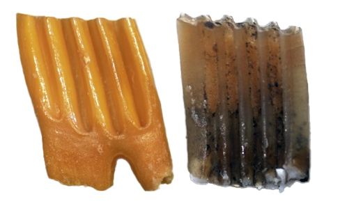 The presence or absence of cement along the valleys of the molar can help in taxonomical recognition. In some taxa, cement is well developed and clearly visible, while in others it is absent or very reduced. This feature, together with tooth morphology and enamel thickness, contributes to species identification.