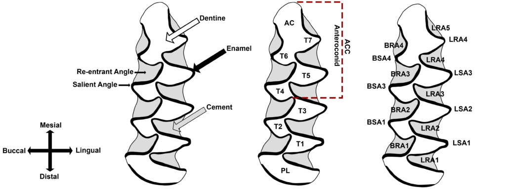The identification process typically follows the scheme proposed by van der Meulen (1972), later refined by other researchers. This approach divides the m1 into three main components: the posterior loop (PL), a series of triangles (T), and the anterior cap (AC). Tooth elements can be described by analyzing the shape of the salient and re-entrant angles, both buccal and lingual (BSA/LSA: buccal/lingual salient angles; BRA/LRA: buccal/lingual re-entrant angles).